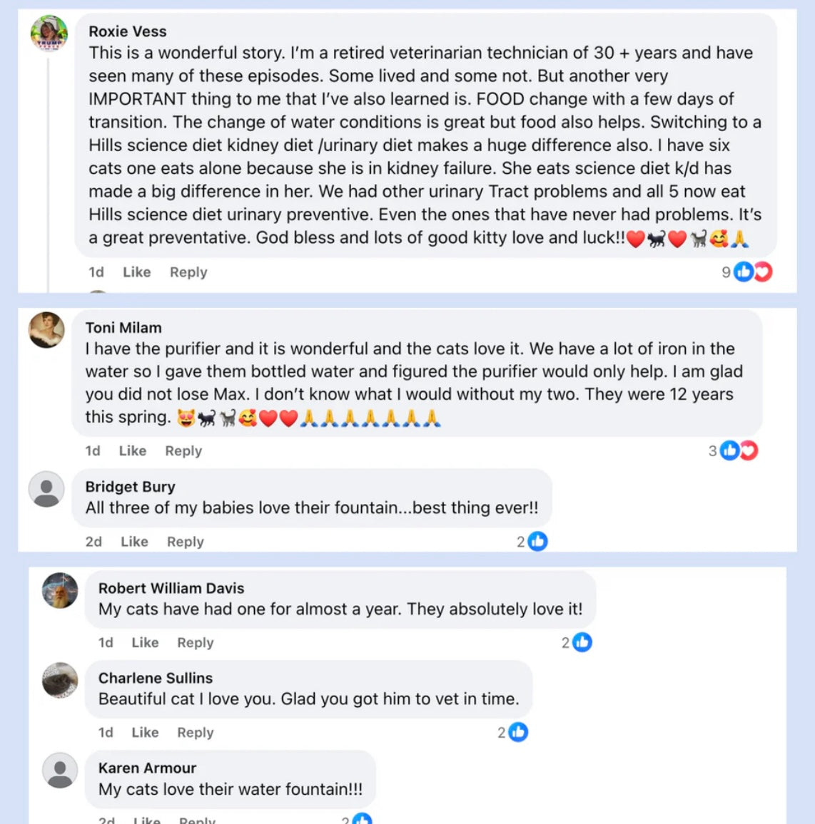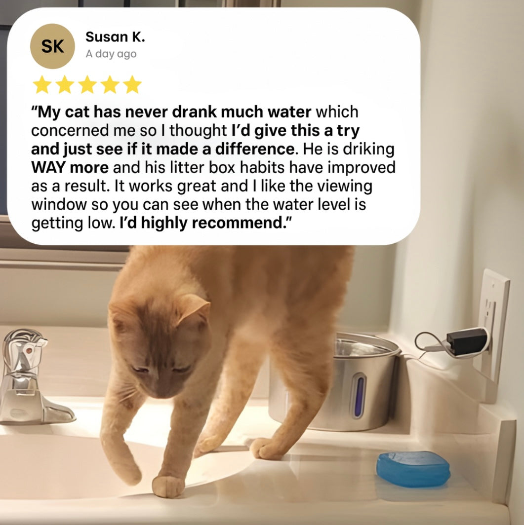 I usually never write reviews but my cats are thrilled and are drinking almost twice as much water as they did when I just had a bowl! Their urine is more diluted and it seems healthier and they are more hydrated.