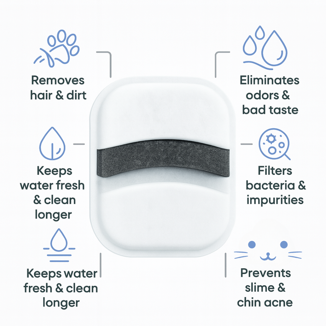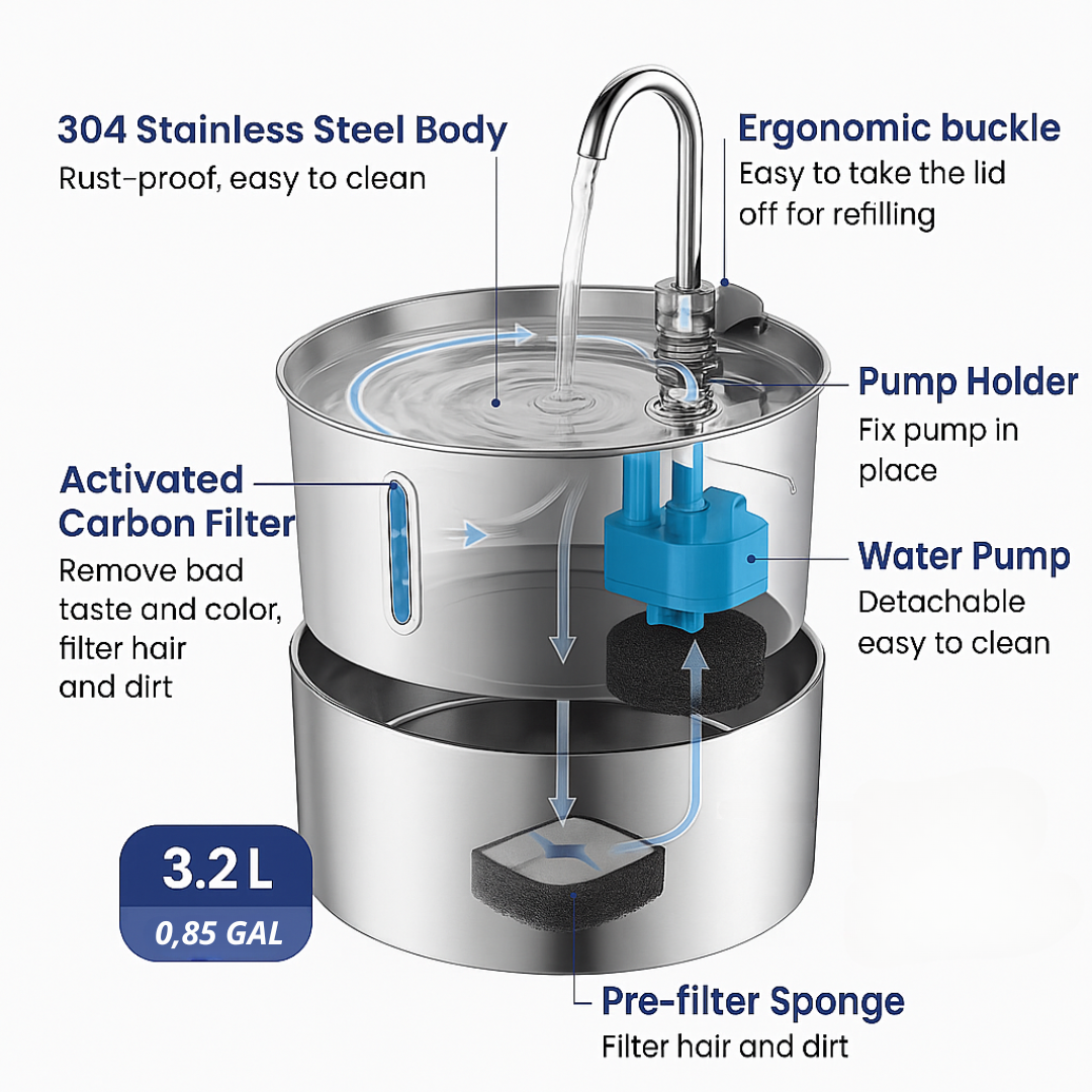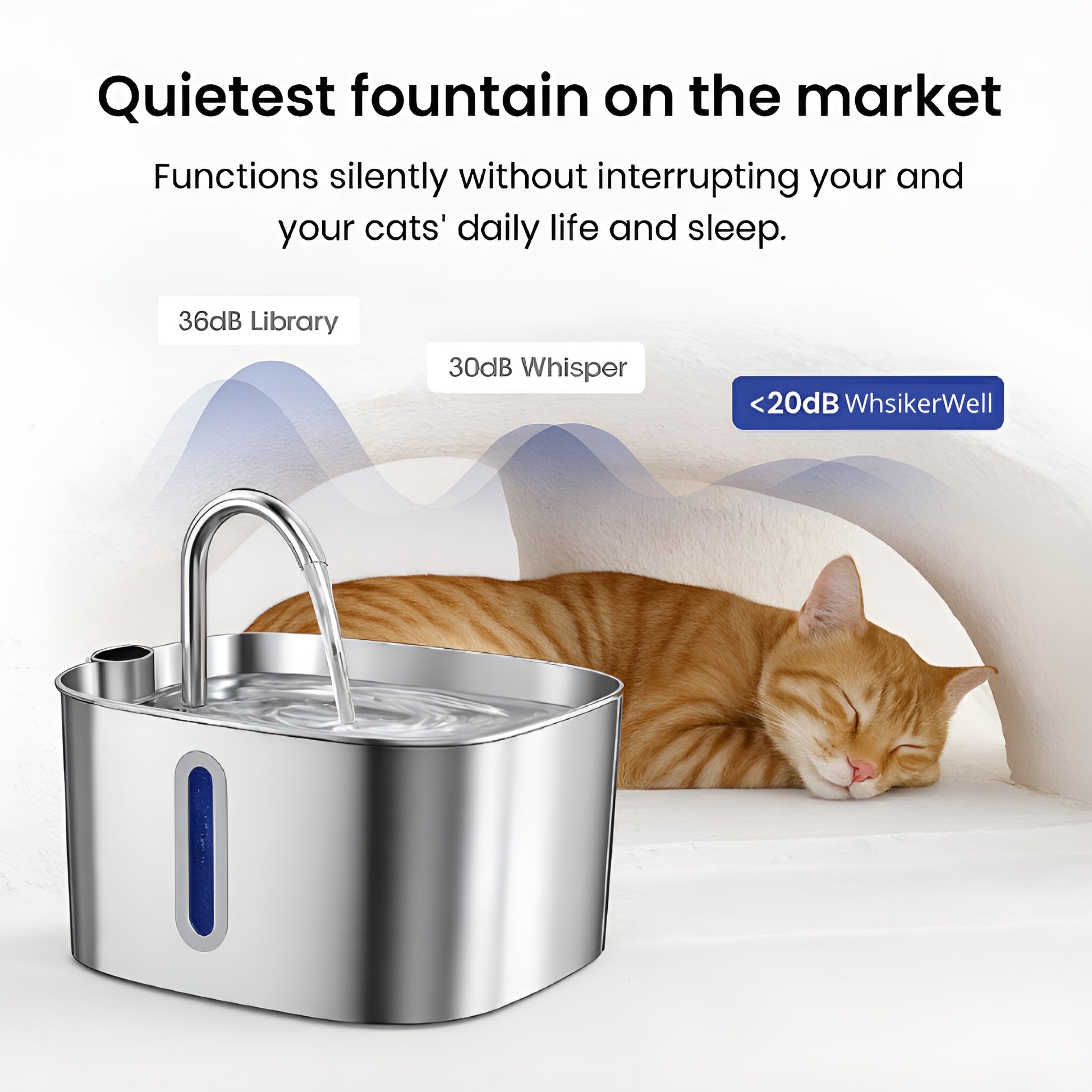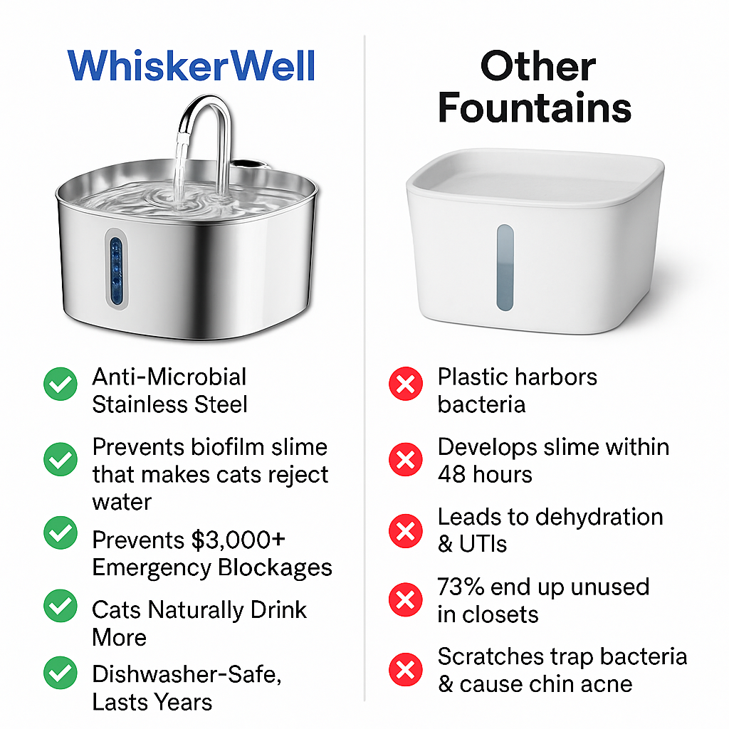 The WhiskerWell fountain uses medical-grade anti-bacterial stainless steel to prevent biofilm formation, while our Triple Filtration System removes impurities that trigger avoidance. This keeps the water clean and flowing — finally satisfying your cat’s "safe water" instincts so it drinks regularly and stays protected.