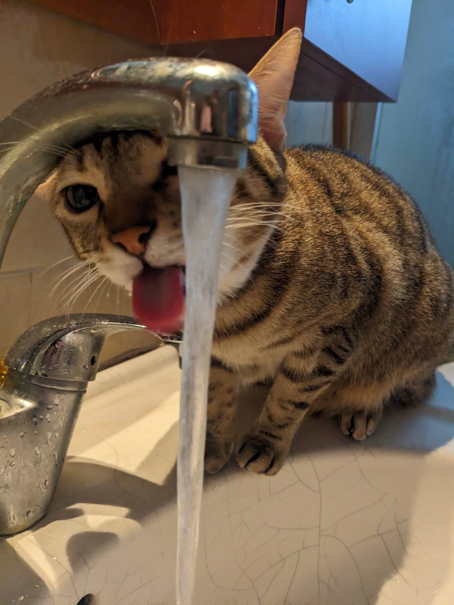 That's why it beg at your sink, drink from the toilet, even lick shower walls over the "clean" bowl — those sources move and refresh like the streams its ancestors trusted.
